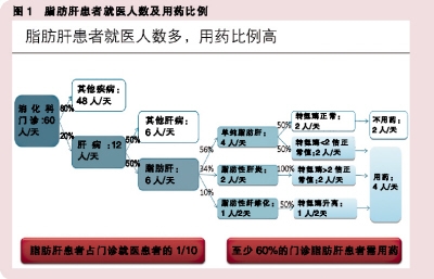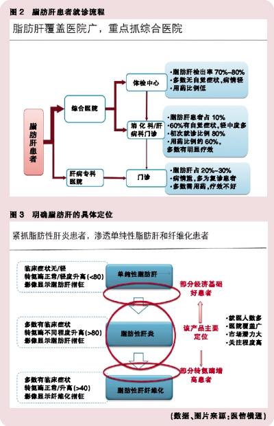 第四步,验证机会。处方药定位不是靠灵感,而是靠逻辑,一个灵感出来后,要用若干否定项去否定它,直到无法否定,选中一两个,然后返回头去完善。验证机会从临床关注度、竞争程度、理论机理、医生接受程度、临床诊疗流程、患者就医心理行为等多个方面进行。调研发现,脂肪肝患者就医人数多,用药比例高,如图1所示。