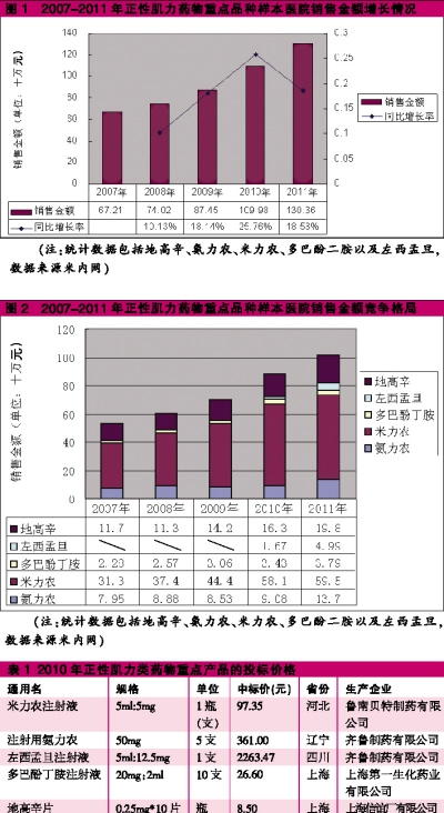 目前,鲁南贝特制药几乎占领了米力农的整个市场,排在正性肌力药物市场中的首位;此外,山东齐鲁制药制药同时拥有氨力农(87%)和左西孟旦(100%)的市场,处于正性肌力类药物的第二位。由于多巴酚丁胺药物市场无法对上述品种的构成威胁,加之低高辛的众多企业投标价格远低于非洋地黄类正性肌药物,无法对米力农、氨力农以及左西孟旦的市场构成强大威胁(见表1),因此正性肌力药物正处于由鲁南贝特和山东齐鲁制药垄断的格局。