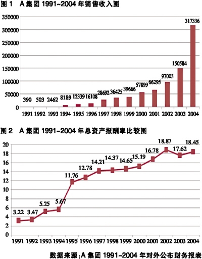 A集团初创于1988年,在实行员工持股改革前,A集团发展速度相对缓慢。1995年,A集团推行以内部员工持股为特色的现代产权制度改革,并以此为基础建立起一套科学、高效的经营管理体制,因此业务大幅增长。2001年A集团在上海证券交易所正式挂牌上市,2004年A集团内部员工股份允许上市流通。A集团在员工持股制度实施前后,公司经营业绩发生了明显的变化:1991~1994年期间,A集团的经营效率相对来说比较低;1995~2004年这段时间内,随着员工持股制度的实行,制度变迁对企业经营效率的影响十分积极,是经营管理绩效提高的主要源泉,企业的销售收入持续、快速提高,总资产报酬率维持在较高水平(见图1、图2)。