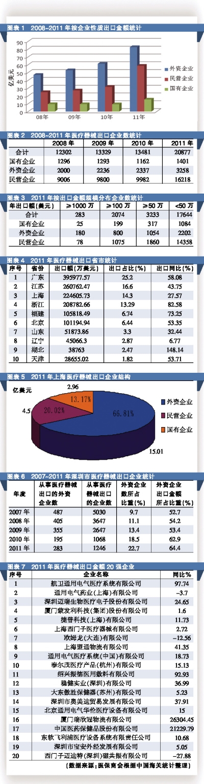 3000多家外商投资企业带动了我国医疗器械出口增长,其出口总额已连续5年占据当年我医疗器械出口总额的“半壁江山”。据海关统计,2007~2011年外企出口额占比分别为58.51%、57.29%、59.01%、58.94%和52.59%,出口额年复合增长率为17.36%。随着国际医疗器械产业加速转移,国外先进技术和资本还将继续采用合资合作、技术输出等形式进入国内,部分依赖进口的仪器设备正逐步实现国产替代进口,使我国成为全球医疗器械重要的生产和研发基地。