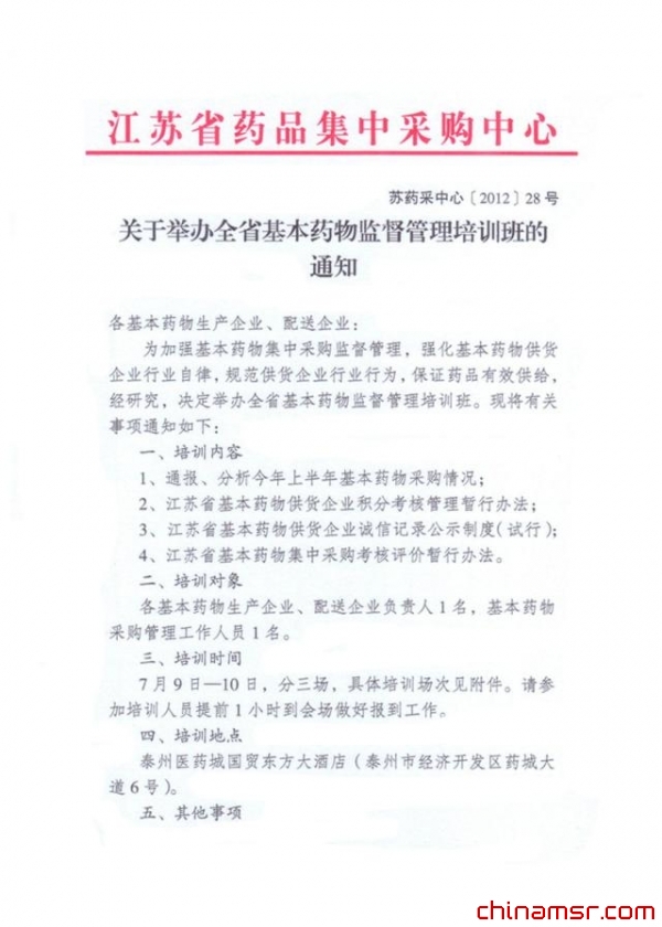 2012年江苏省关于举办全省基本药物监督管理培训班的通知