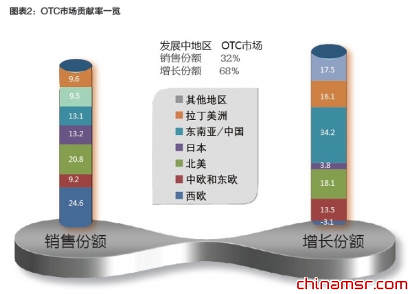 放眼全球,OTC市场非常坚挺,即使在金融危机之后,OTC也呈现逆势增长,超越整体医药市场和处方药市场。(参见图表1)