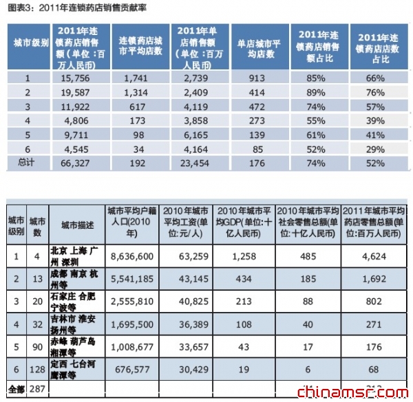 2011年,IMS对全国287个地级及以上城市的药店进行了普查(仅限于药品与保健品等相关产品,不包含药店渠道销售的食品粮油类产品),结果显示,零售药店渠道的连锁化趋势非常明显, 大中城市尤甚。而从整体表现来看,连锁药店以52%的店数占比,贡献了75%的销售额,大中城市甚至高达85%。因此,连锁药店的规模效应令其本身也作为一个大品牌走向更广阔的市场。(参见图表3)