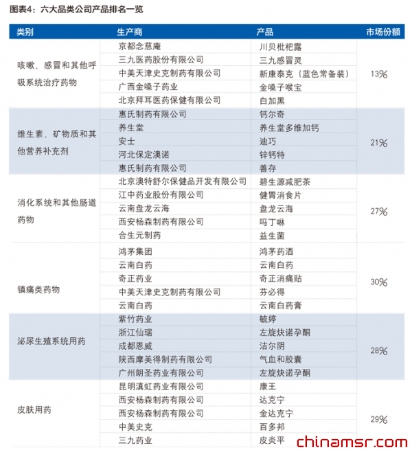 其中,在OTC和保健品类别里,78%的销售贡献都来自于六大品类:1)咳嗽、感冒和其他呼吸系统治疗药物;