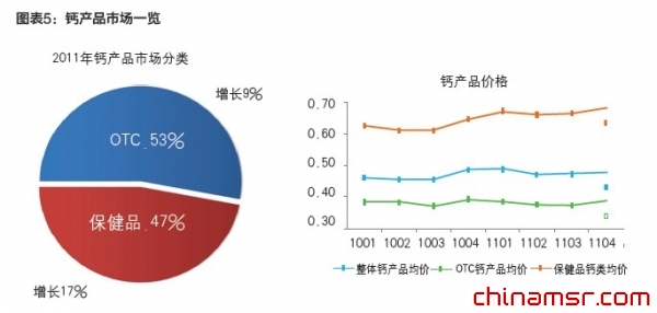 不得不说,保健品的崛起与大健康理念的兴起是密不可分的。以钙产品为例,钙类OTC产品占53%的市场, 但是增速却仅为钙保健品增速(17%)的一半左右;同时,钙保健品的价格比市场均价要高出四成多,而且在钙市场销售前20名的企业中,保健品生产商的销售额增长也要高于市场平均水平。(参见图表5)