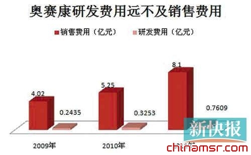 如果再进一步分拆,更发现,奥赛康的主营收入大部分就来自奥西康。因为2009年至2011年,奥西康销售额占主营业务收入的比重分别为68.4%、66.96%、52.74%,对毛利的贡献均超过50%。