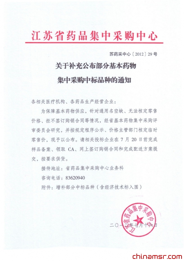 2012年江苏省关于补充公布部分基本药物集中采购中标品种的通知