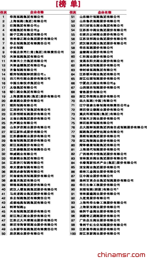 据了解,此次评选于2012年初启动,时间跨度为2011年,通过对中国境内注册的制药企业进行密集式调查,以企业年度制药工业的销售收入金额为统计指标口径得出的百强名单。