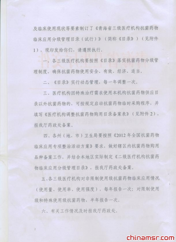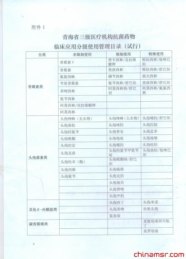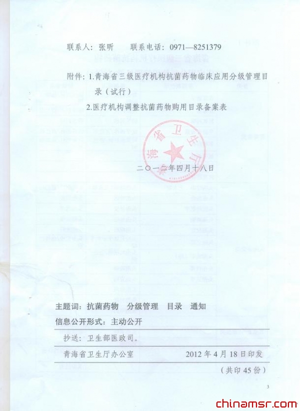 2012年青海省关于印发三级医疗机构抗菌药物临床应用分级管理目录(试行)的通知
