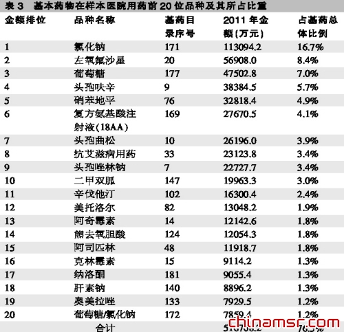 品种分析表明,2011年基本药物在样本医院购药金额最大的前20位品种,22城市样本医院购药金额达到52亿元,占到基药总体金额的76.5%(见表3。在国家基本药物目录中,有5个品种名称并不是单一的通用名品种,即目录中序号33抗艾滋病用药、序号36青蒿素类药物、序号141右旋糖酐(40,70)、序号186国家免疫规划用疫苗、序号205避孕药,实际上是包括了几个药品。为了与样本医院数据进行比对分析,按照经验,本文将这几个序号的基药落实到了具体品种)。其中,位居前5位的药物及其占基药总体的比重依次是氯化钠16.7%、左氧氟沙星8.4%、葡萄糖7.0%、头孢呋辛5.7%及硝茶地平4.9%。前20个品种里面,抗生素品种有6个。