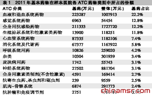按照ATC药物分类体系,基本药物在22城市样本医院14个大类药物中所占份额最高的是血液和造血系统药物类别,2011年占比为22.2%。基本药物所占份额超过10%的ATC大类,依次是感觉系统药物12.8%,全身抗感染药物12.2%,生殖泌尿系统和性激素类药物11.8%,其余10个大类均在8%以下,最小占比为抗肿瘤和免疫调节剂只占0.2%,本类中的基本药物都属于免疫调节剂(见表1)。