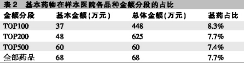 为了进一步了解基本药物在样本医院中的用药情况,通过对样本医院用药品种按用药金额排序进行分段分析(品种用药金额TOP100/TOP200/TOP500),结果显示,基本药物在用药金额前100位、前200位、前500位各分段中的占比差别不大,在前100位用药品种金额占比达到8.3%,比在全部药品7.7%的占比略高(见表2)。基本药物在医院用药结构中分布比较均衡,主流用药与非主流用药品种分布没有明显的偏向。