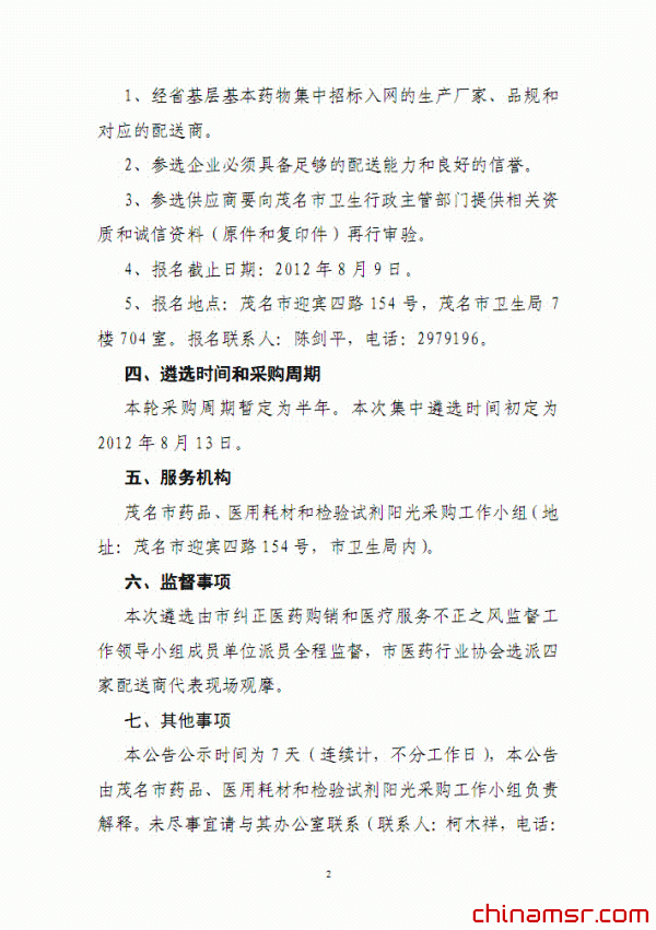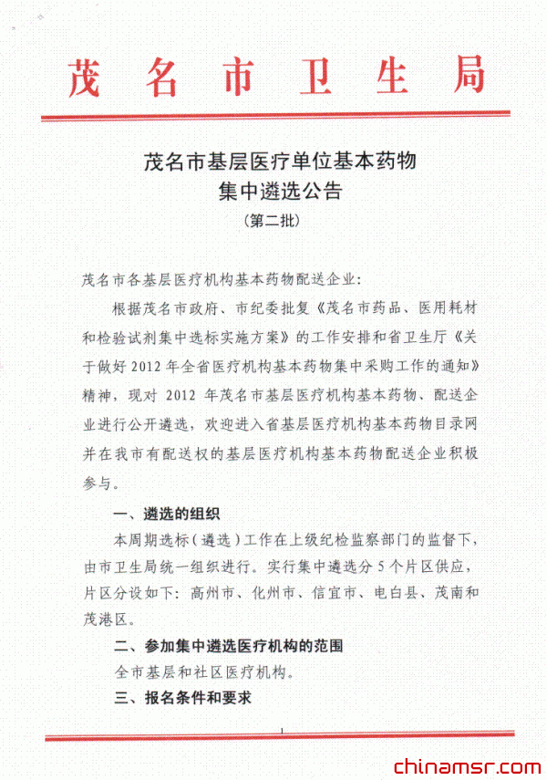 2012年广东省茂名市基层医疗单位基本药物集中遴选公告
