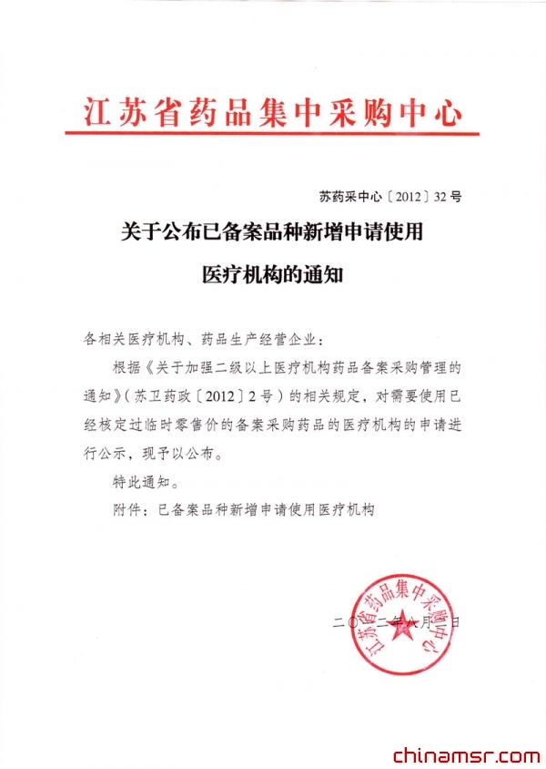 2012年江苏省关于公布已备案品种新增申请使用医疗机构的通知