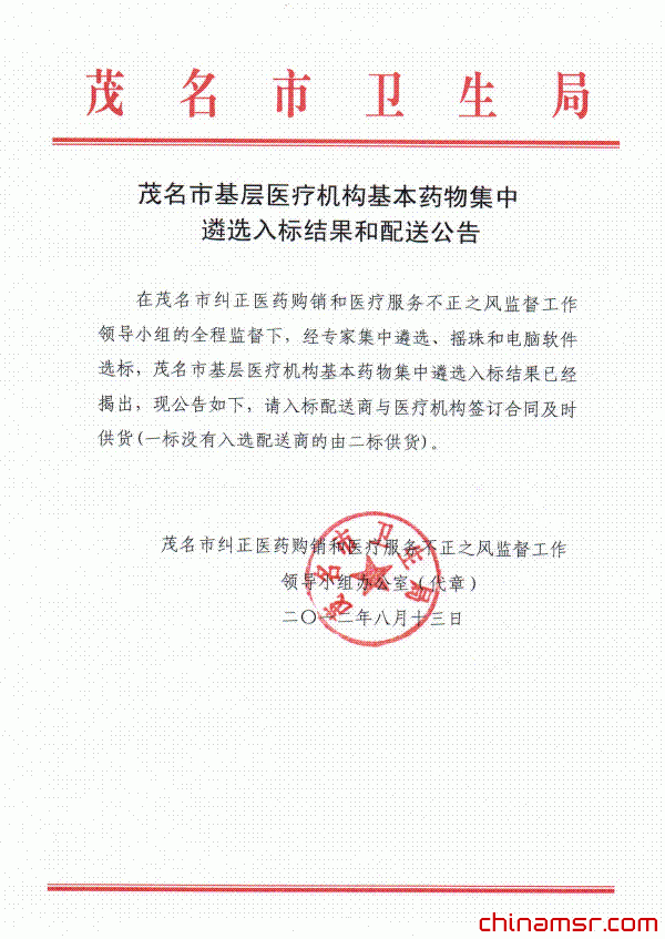 2012年广东省茂名市基层医疗机构基本药物集中遴选入标结果和配送公告