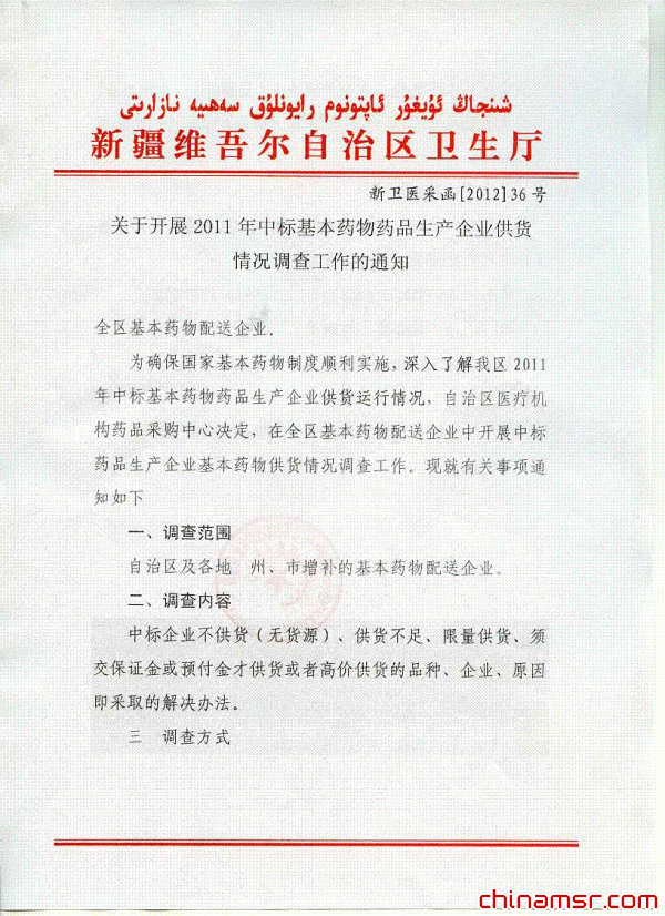新疆维吾尔族自治区关于开展2011年中标基本药物药品生产企业供货情况调查的通知
