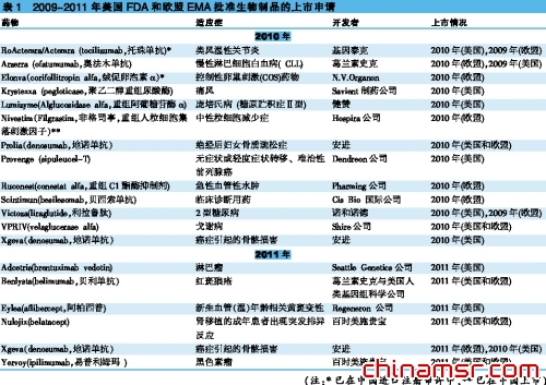 2010年和2011年,美国FDA和欧盟EMA共批准了19件生物制品的上市申请(见表1),其中,2010年更是批准了13件之多。然而与2009年欧美共批准20件生物制品的上市申请相比,2010年和2011年似乎还略显逊色。在2010年和2011年的2年期间,欧美批准的生物制品(除去重复品种)共有16种,包括9种抗体、4种融合蛋白、3种酶以及酶抑制剂、激素和细胞集落刺激因子。就治疗领域而言,癌症与癌症相关适应症有6种产品占比最多。
