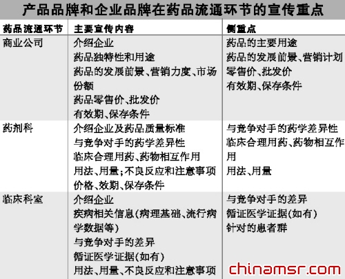 近年来,用药安全事故引起社会广泛关注,处方药的推广方式也应从单纯依靠销售行为向强有力的品牌驱动转变。品牌建设的终极目的是扩大在目标群体中的知晓率与美誉度,形成竞争壁垒,以保持市场份额的相对稳定。因此,扩大宣传受众,加强产品品牌与企业品牌的契合,应成为处方药品牌建设的一个重要组成部分。处方药营销环节较多,产品与企业的“信息流”应伴随着药物流通的“物流”而不断强化,包括商业公司、药剂科、医生,甚至护士等都有宣传的必要,只是侧重点有所不同。