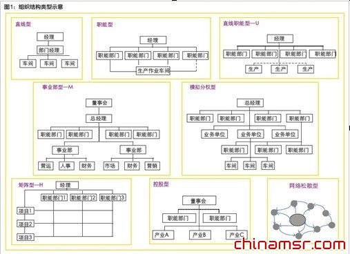 基于不同的划分方式,企业的组织结构有很多种类型。笔者认为,理想的、比较纯粹的组织类型主要有8种,其中最基本、最普遍的是直线职能型和事业部型两种。(参看图1)