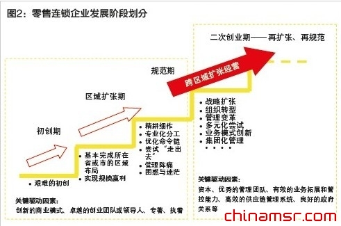 当企业经历规范期后,一旦获得一定的资源和能力水平,“二次创业”便会开始——通过收购、兼并、区域联合或自行选址开店等方式实现跨区域的扩张,利用资源共享向相关产业延伸以培育新业务、新市场,探索新业务模式等。(参看下页图2)