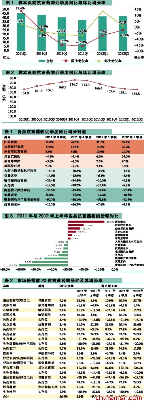 今年是为期三年的全国抗菌药物临床应用专项整治活动的第二年,与上一年度方案相比,整治活动要求更明确、严格与细致。从2011年第二季度开始,经过去年连续3个季度的下降后,今年1季度开始出现环比增长, 2季度再次环比增长。由此可见,抗菌药物迅速下降阶段或已终结,下降明显趋缓,已显现出止跌企稳的态势(见图1),但细分品类间的市场表现明显不同。