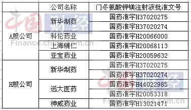 记者查询到,国内共有44家药企持有49个门冬氨酸钾镁注射液生产批号。其中包括新华制药、科伦药业、上海辅仁、亚宝药业、远大医药、神威药业在内的多家A股或港股上市公司牵涉其中。A+H股上市公司新华制药持有两个规格的批准文号,分别是“国药准字H37020275”、“国药准字H37020274”的产品。另外A股公司中,科伦药业、上海辅仁、亚宝药业均持有1个批准文号,分别为“国药准字H20066000”、“H20068113”、“H20059632”。此外还有两家港股公司持有2个批准文号。(如图所示)