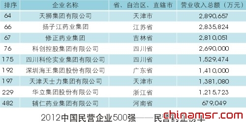 但不得不注意的是,在取得巨大成就的同时,民营药企内部、市场外部等各方面也都暴露出制约企业发展的障碍,使目前民营医药企业陷入“发家容易”、“发展难”的窘境。从这几年中国民营企业500强的名单来看,几乎没有新增成员——2011与2012年该名单中,药企都仅有9家,排序上稍有变化,但入围企业依旧(见上表)。