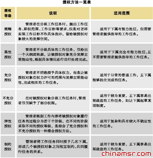 在授权过程中,管理者要根据不同工作的性质、特点,选择合适的授权等级进行授权。一般而言,授权等级可分为模糊授权、柔性授权、充分授权、不充分授权、弹性授权、制约授权等类型,不同等级有着不同的适用范围。详见下表。