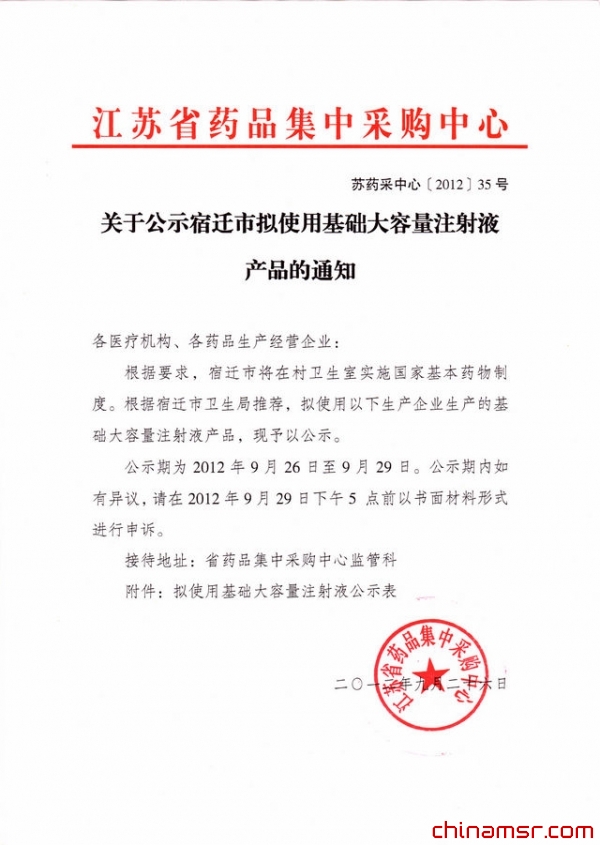 2012年江苏省关于公示宿迁市拟使用基础大容量注射液产品的通知