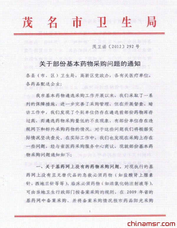 2012年广东省茂名市关于部分基本药物采购问题的通知