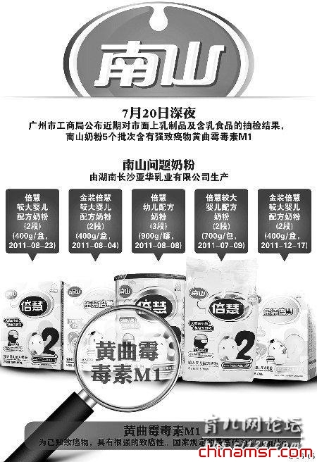 7月20日,南山奶粉被查出含有强致癌物黄曲霉毒素M1,引发社会关注。