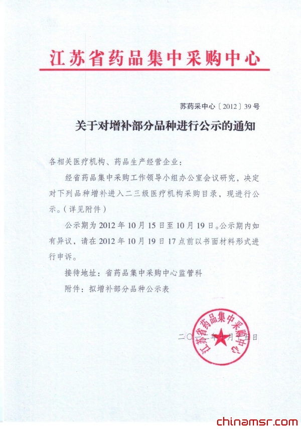 江苏省关于对增补部分品种进行公示的通知