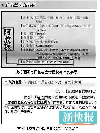 在新快报10月24日的报道中,记者通过调查即发现,虽然在“桃花姬阿胶糕”的外包装上只看到“食品生产许可证号”的字样,并没有出现保健品应有的“食健”相关标识,但东阿阿胶广州直营店人员和官方商城的客服都称,这是保健食品。