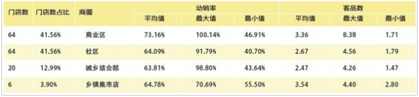 连锁药店加强关联销售的目的是挖掘顾客的潜在需求,激发顾客的购买欲望,最终实现店客双赢,满足顾客需求,实现门店盈利。那么,目前连锁药店的关联销售能力如何呢?7月份,笔者曾组织做了一个专门针对连锁药店关联销售能力的数据调研,详细分析了16家连锁154个门店2012年7月的中西成药相关数据,从商圈、门店营业面积、客流量、库存商品品种数、大夫坐诊等多个维度,来观测药店的动销率(销售品种数/当前(库存)商品品种数)、客品数(销售数量/客流量)和相关维度之间的关系。而在分析商圈维度的时候,我们发现了一个很有意思的现象,数据见下表。
