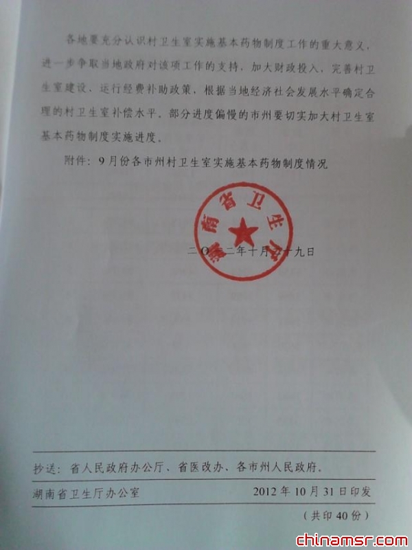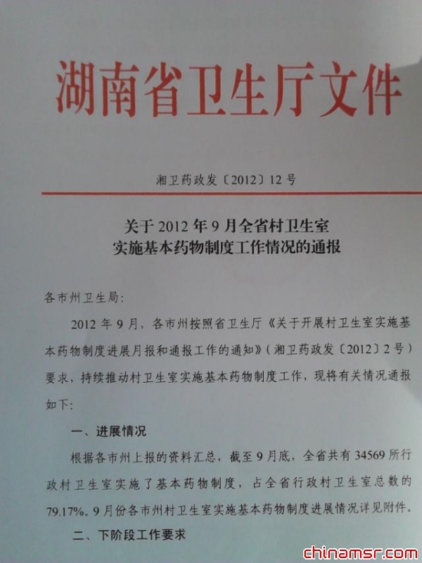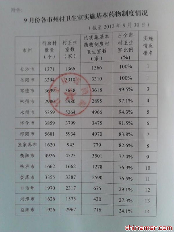 2012年湖南省卫生厅关于9月全省村卫生室实施基本药物制度工作情况的通报