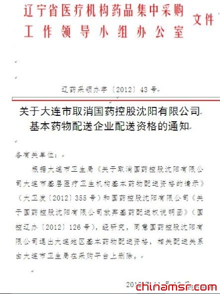 2012年辽宁省关于大连市取消国药控股沈阳有限公司基本药物配送企业配送资格的通知