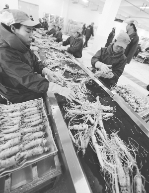 11月23日,工人在分拣经过清洗的人参。当日,我国最大的人参产业园在吉林省集安市落成投产。该人参产业园由康美药业投资兴建,每年可加工人参4000吨以上,销售年收入达到17亿元。新华社记者 张楠 摄