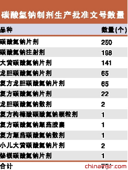 碳酸氢钠的制剂品种有片剂、胶囊、颗粒剂、散剂、复方制剂、注射剂等,目前全国共有碳酸氢钠制剂生产批准文号751个。