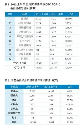 MDC和CMH联合发布的数据显示,2012年上半年,52城市OTC占药品57%的份额,同比增长幅度为12.3%。同时,在销售规模前十的品类中,感冒药、维生素\矿物质、泌尿补肾类用药是三大环比增长速度最快的品类。