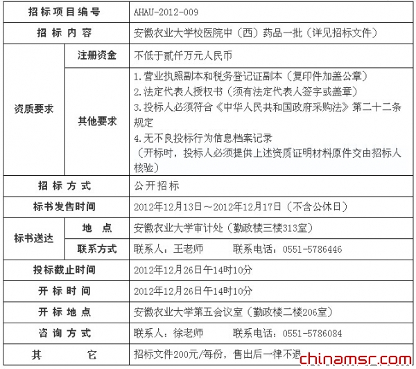 2012年安徽农业大学校医院药品招标公告(AHAU-2012-009)