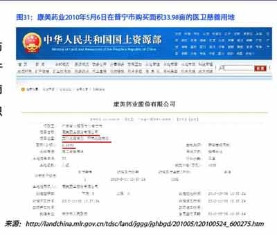 国土资源部网站信息显示,康美药业于2009年11月27日购买了位于普宁市占陇镇广汕公路南侧的一块土地,土地面积2.194公顷(合32.91亩),使用年限是70年,土地成交价277万元。