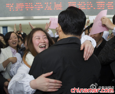 女研究员热情拥抱胡锦涛