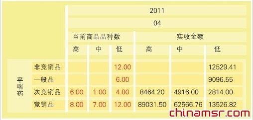 上图是平喘药的商品结构表,从中可以看到缺少高价格带的非竞销品(高毛品),而同一价格带上,竞销品(品牌药、低毛利品或倒挂商品)有8个。如果这时进来一个有高消费能力的顾客,要购买平喘药,这时我们的店员一般都后推荐低价格带上的高毛品,而不会推荐高价格的品牌药,这样就发生了反向的价格带拦截。大多数情况下,这个顾客会什么都不买,转身到隔壁的药店去购买。这样,这个顾客就流失了。中国药店:www.zgyd.org