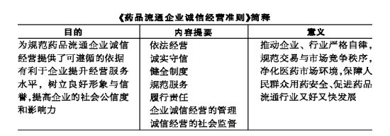 在《药品流通企业诚信经营准则》中,分别从依法经营、诚实守信、健全制度、规范服务、履行责任等五个方面提出了明确的要求,并对诚信建设的管理与社会监督作出了指引。