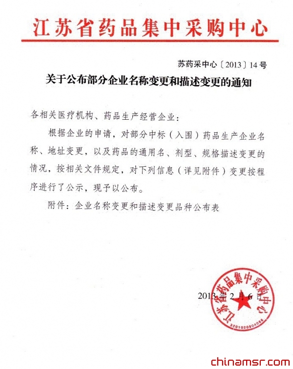 2013年江苏省关于公布部分企业名称变更和描述变更的通知
