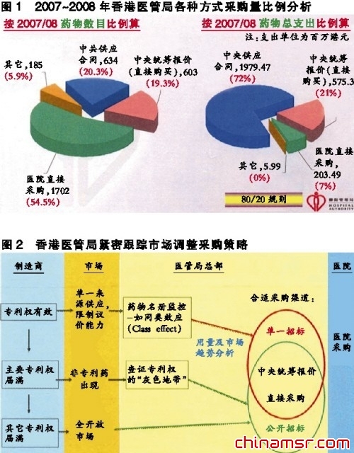 香港医管局遵循了WHO的建议,将药品采购流程分4个部门管理:总药剂师办事处,负责对药品品种和质量的评选,提出招标项目;中央药物采购组,负责制定并执行采购程序;投标书评估小组,负责对投标书的核实、评议和推荐;中央投标委员会,负责审批获推荐的投标书。