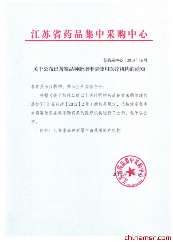 2013年江苏省关于公布已备案品种新增申请使用医疗机构的通知