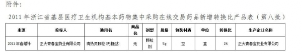 根据《2011年浙江省基层医疗卫生机构基本药物集中采购实施方案》的规定和医疗卫生机构临床治疗的需要,经审核,现公布在线交易药品新增转换比(详见附件)。其统一采购价格和集中采购药品零售价已由省物价局公布,新增转换比产品的配送方案等与原在线交易药品一致。