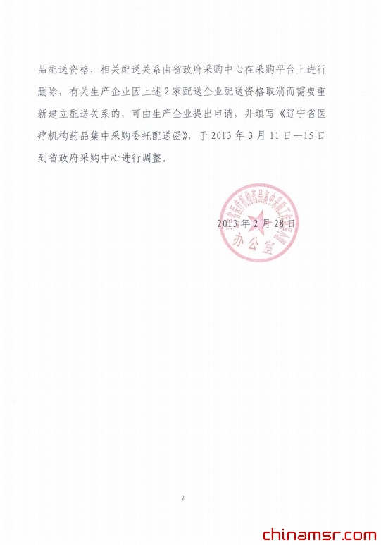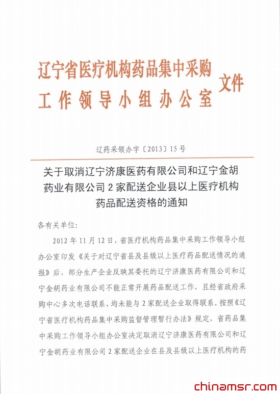 2013年辽宁省关于取消辽宁济康医药有限公司和辽宁金胡药业有限公司2家配送企业县以上医疗机构药品配送资格的通知