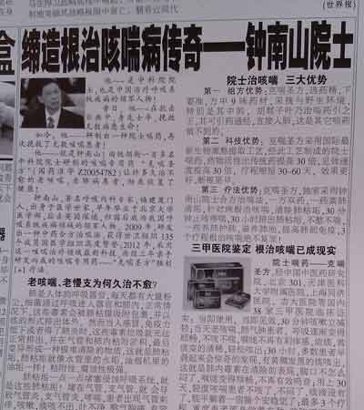 全国人大代表、被誉为中国人的良心代言人,钟南山院士“被”代言虚假医药广告。刊登的报纸是《军事大参考》、《环球文荟》和《军事周刊(团结报)》2月3日出版。这都是些什么报纸啊?主要在地级和县级城镇发行,欺骗信息不灵通的基层人民。虚假广告称:他是中科院院士(其实是工程院院士),是他研制出一种院士喘药,由他领衔一百多位中科院院士研制的咳喘专用药xxx。